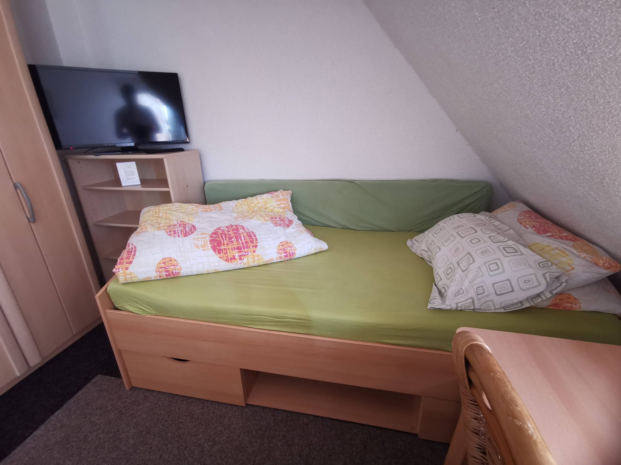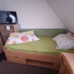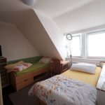 Zimmer 3 – (Obergeschoß): 2 x Einzelbett (90 x 200 cm) Nachttisch, Tisch und Stuhl, Kleiderschrank Teppichboden, Heizung Fenster Richtung Norden